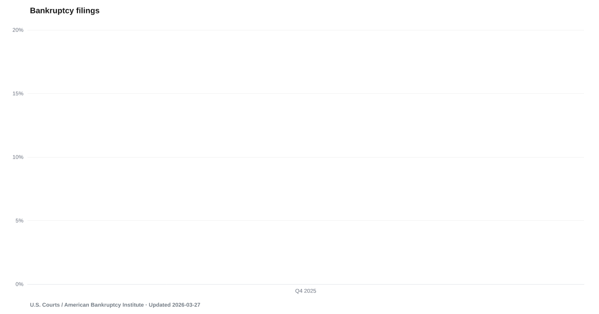 Total consumer bankruptcy filings rose 20% year-over-year in Q4 2025, according to U.S. Courts data. Filings have risen year-over-year every quarter since early 2023, the longest sustained increase since the aftermath of the Great Recession.