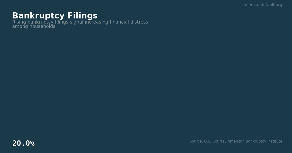 Bankruptcy is the terminal event in the distress pipeline. It begins with depleted savings (The Buffer at 3.6%), moves through missed payments (Falling Behind at 4.8%), and may pass through Foreclosure Filings before arriving at the courthouse. The 20% increase represents families who ran out of alternatives months or years ago.
