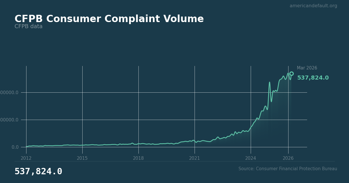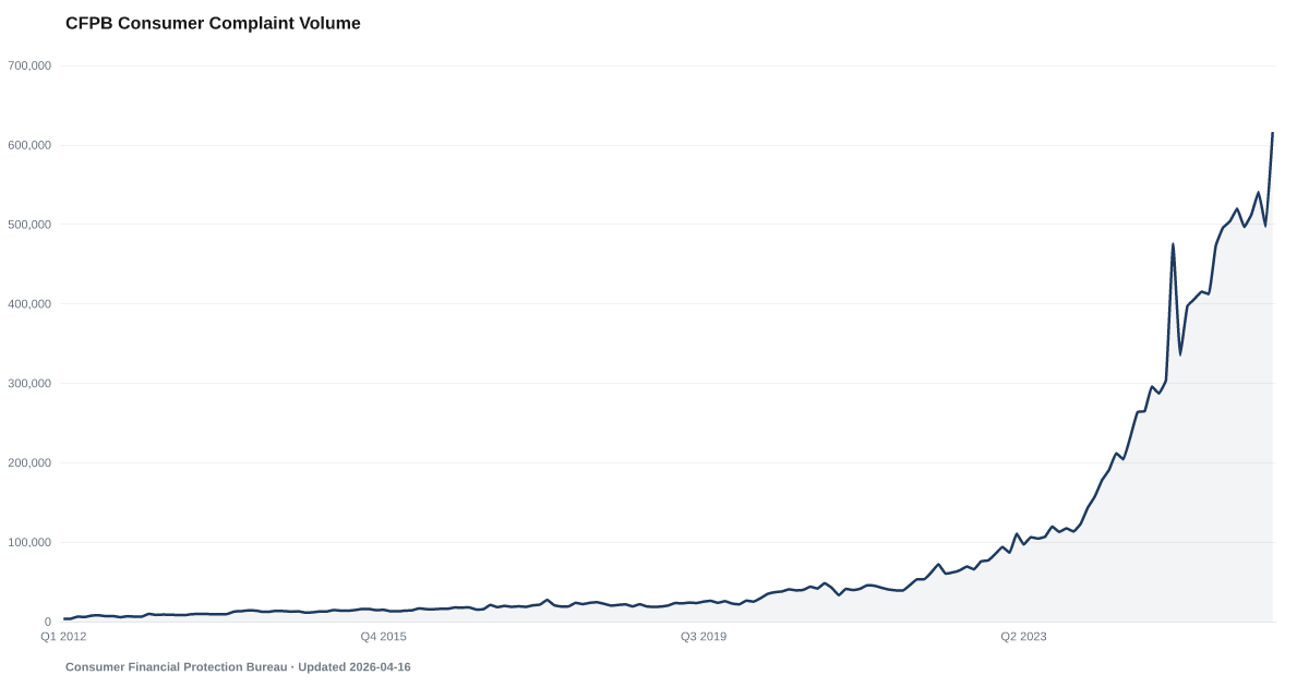 Rising CFPB complaints signal increasing friction between consumers and financial institutions — often a leading indicator of servicing failures, fee disputes, and collection problems that compound financial distress.