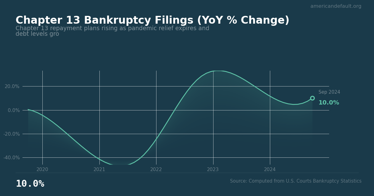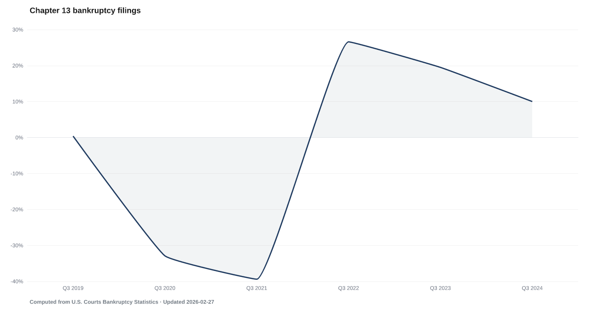 Chapter 13 bankruptcy filings increased 10.0% year-over-year in the latest data. While growing slower than Chapter 7, the increase signals rising need for court-supervised debt restructuring.
