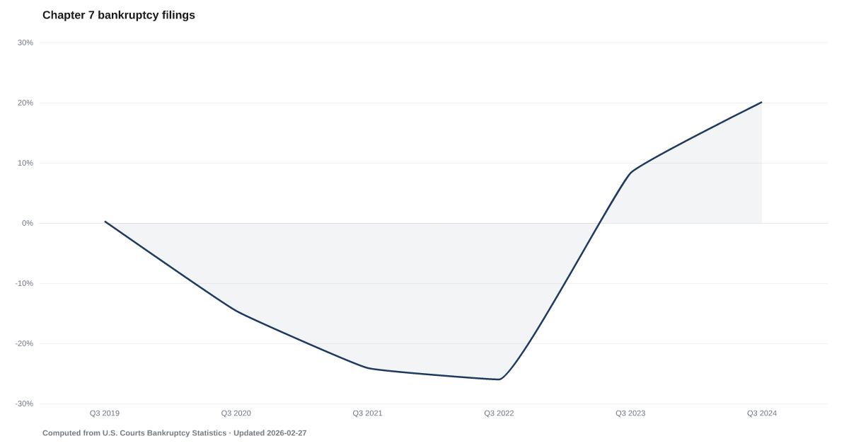 Chapter 7 bankruptcy filings increased 20.1% year-over-year in the latest data, indicating accelerating financial distress among households with no ability to repay debts.