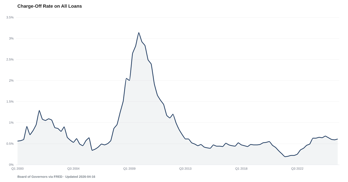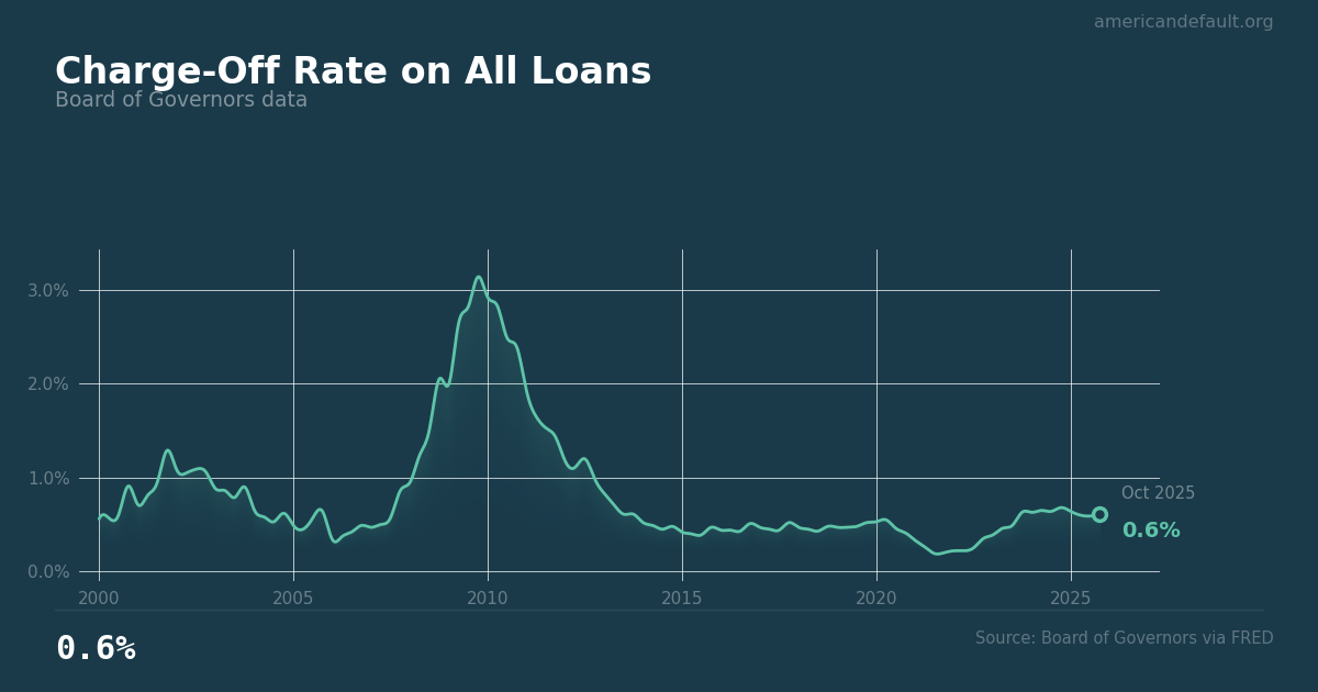 The charge-off rate measures the percentage of total loans that banks write off as uncollectible losses. At 0.61%, it reflects the aggregate loss rate across all commercial bank loan portfolios.