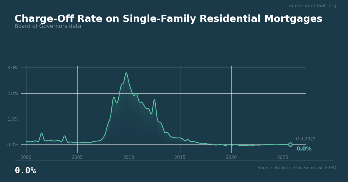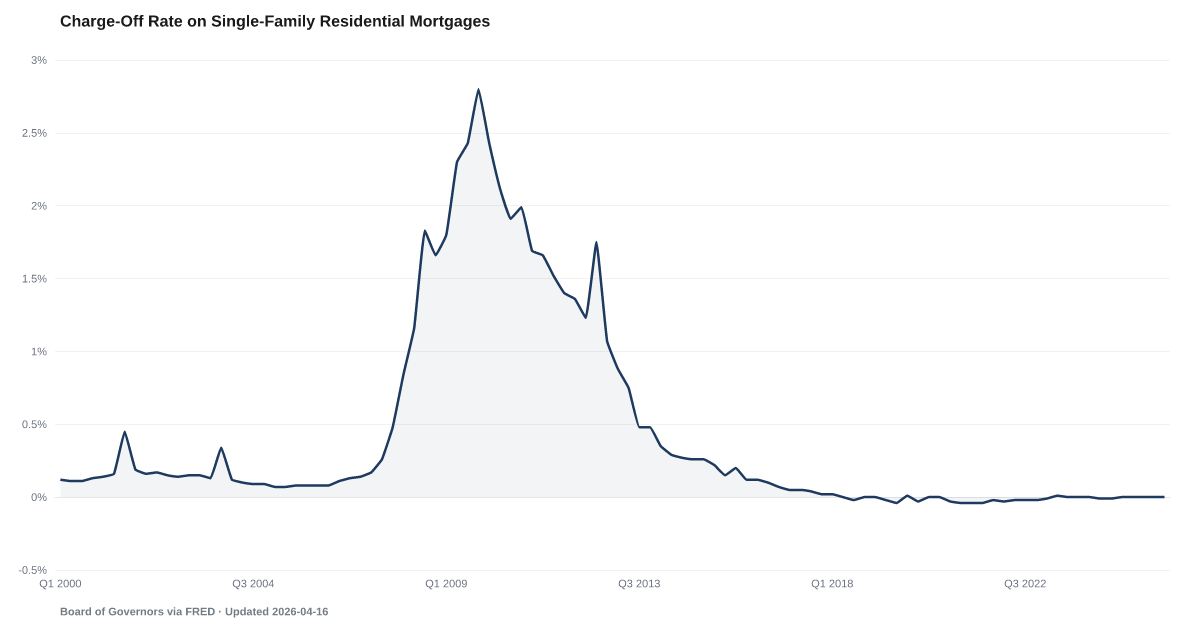 The mortgage charge-off rate measures the percentage of single-family home loans that banks write off as uncollectible. Currently near 0.0%, it remains historically low.