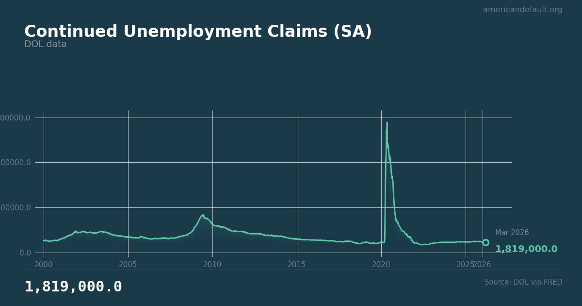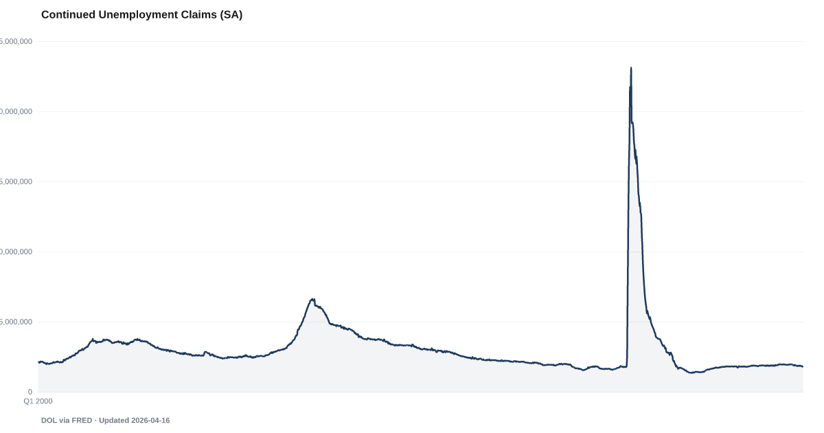 Continuing unemployment claims (insured unemployment) stood at 1.85 million as of the latest weekly report, according to the Department of Labor. Unlike initial claims which measure new job losses, continuing claims show how many people remain unemployed and collecting benefits — a signal of how long displaced workers stay jobless. Source: Department of Labor via FRED (CCSA).