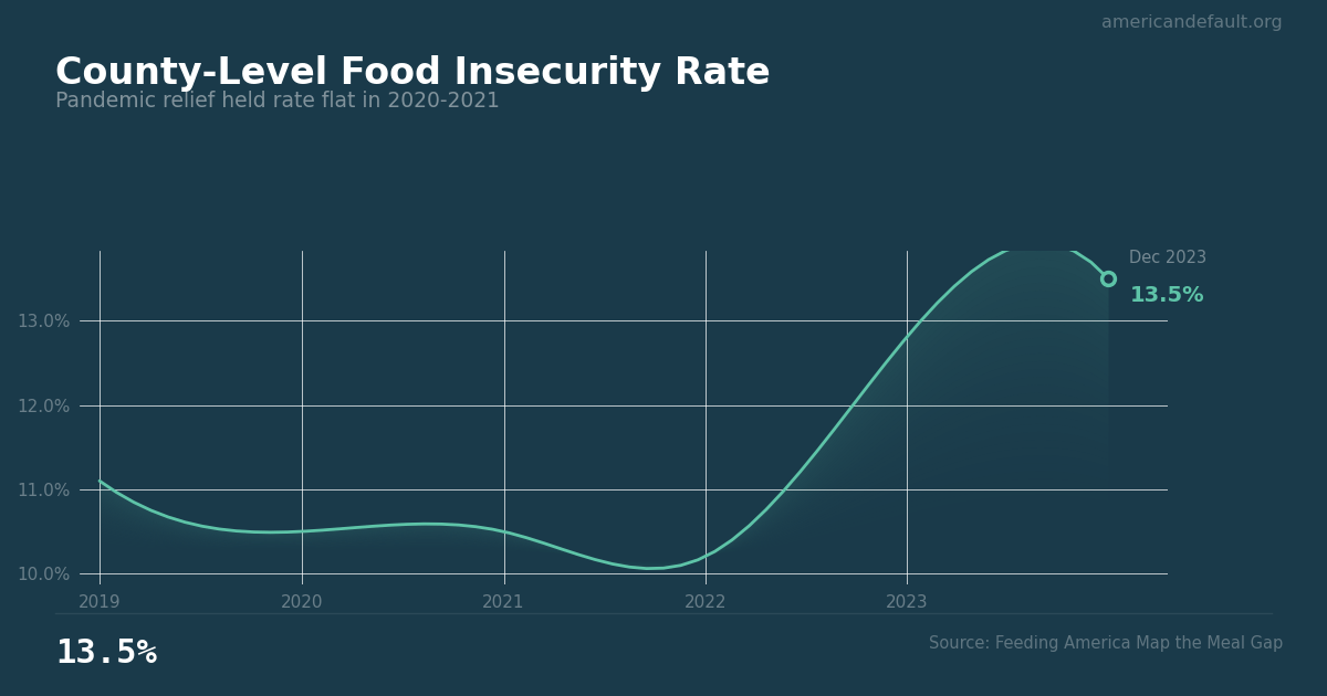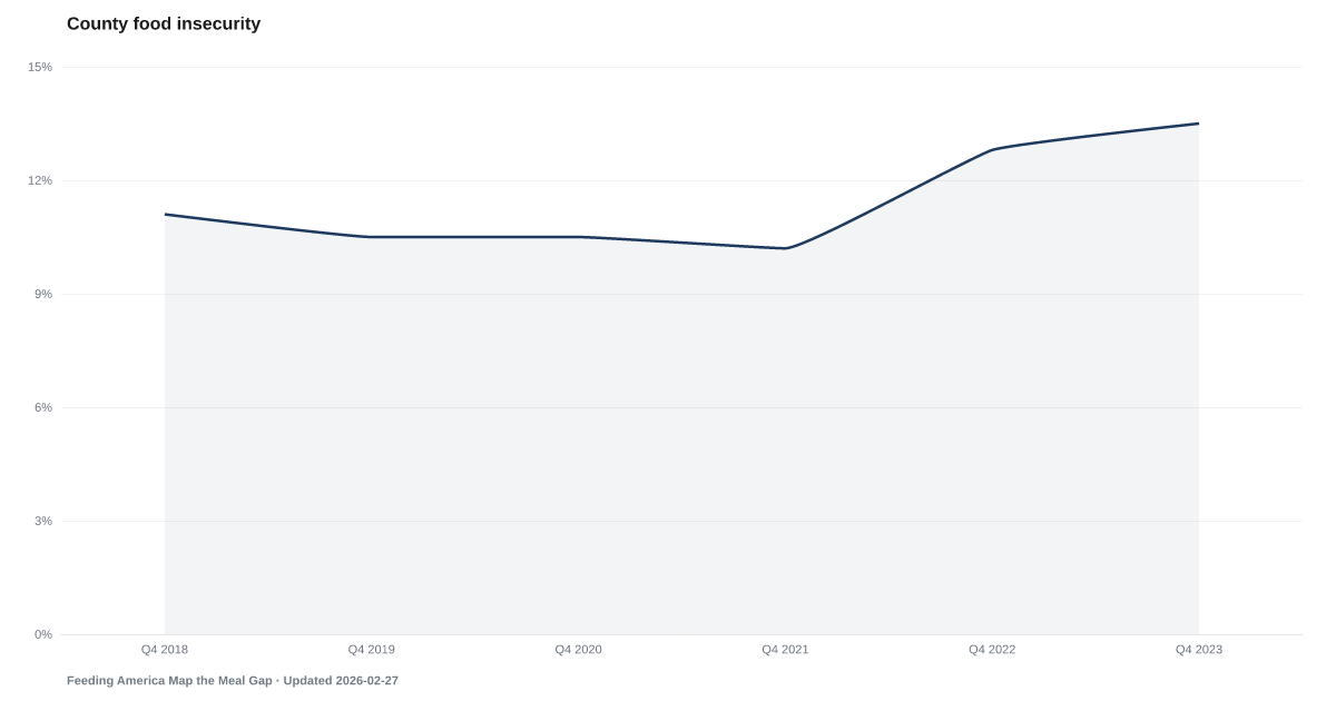 County-Level Food Insecurity Rate: 13.5% as of 2023, and worsening. Source: Feeding America Map the Meal Gap.