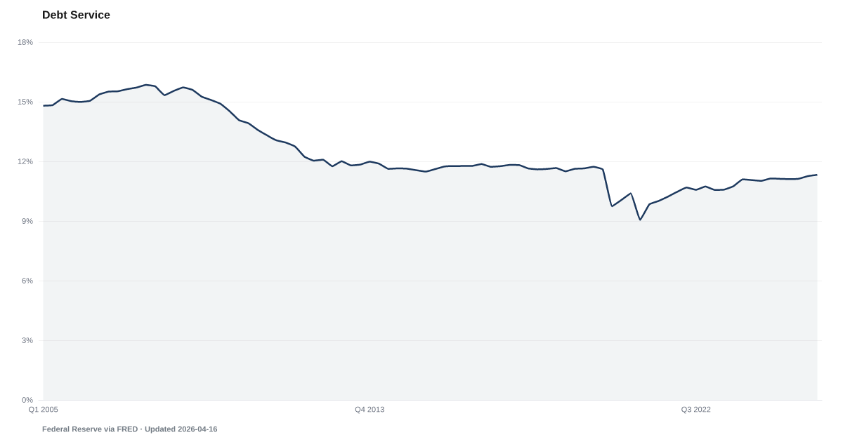 The current 11.3% is below the 15.8% peak reached before the 2008 financial crisis. However, the composition has shifted: mortgage debt service is lower due to historically low rates locked in during 2020–2021, while non-housing debt service (credit cards, auto loans) has increased significantly.