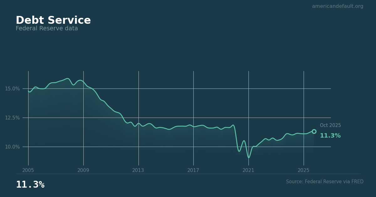 U.S. households spent 11.3% of disposable personal income on debt service payments in Q3 2025, according to Federal Reserve data. This includes mortgage payments, credit card minimum payments, auto loan payments, and student loan payments.