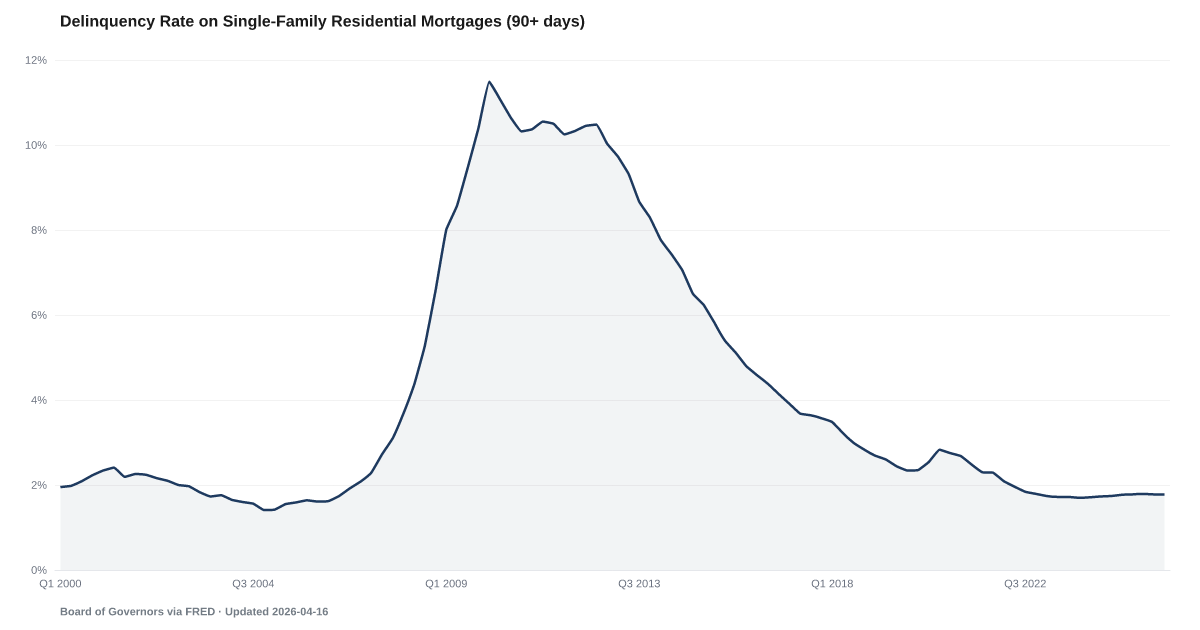 The serious mortgage delinquency rate on single-family residential loans was 1.78% in Q4 2025, according to the Federal Reserve Board (FRED series DRSFRMACBS). This measures loans 90+ days past due at all commercial banks — the threshold where foreclosure proceedings typically begin. The current rate is stable and well below the 11.4% crisis peak in Q1 2010, but represents the conventional mortgage universe only. FHA-insured loans, tracked separately, show 11.52% delinquency — a 6.5x multiplier that the blended national rate obscures. Source: Board of Governors via FRED (DRSFRMACBS).