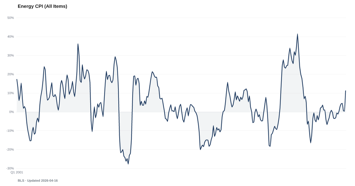Energy CPI rose 0.34% year-over-year in the latest BLS report, well below the peak of 41.6% reached in June 2022.