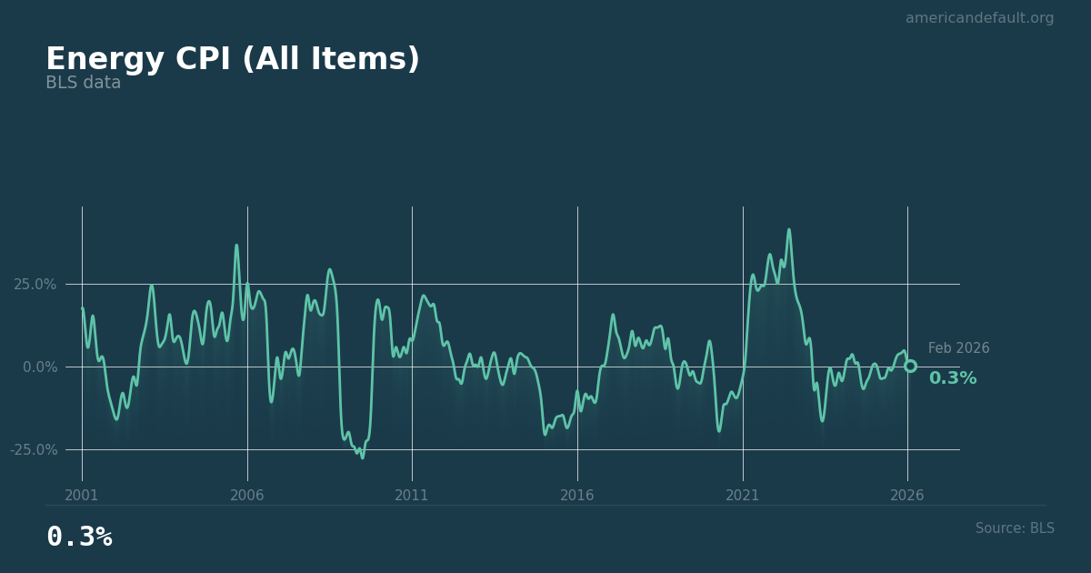 BLS data. At 0.3% annual change, energy is providing rare CPI relief. But this calm follows a 41% spike in 2022 — the base effect makes the reading look better than the price level.