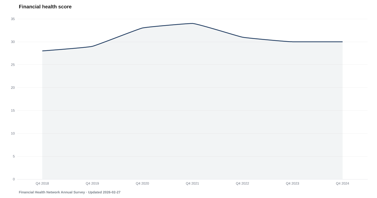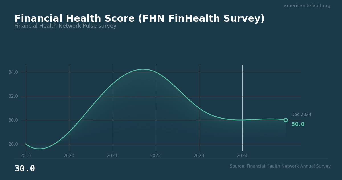 Financial Health Score (FHN FinHealth Survey): 30 as of 2024, and worsening. Source: Financial Health Network Annual Survey.