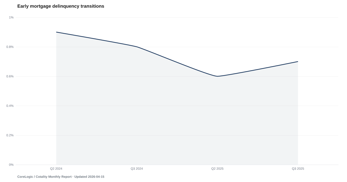 CoreLogic's early-stage transition data tracks the rate at which current mortgages move to 30-day delinquency for the first time — the earliest measurable signal in the mortgage distress pipeline. A rising transition rate indicates that homeowners who were previously current are beginning to fall behind, often months before these mortgages appear in standard delinquency statistics. Source: CoreLogic Early-Stage Delinquency Transitions.