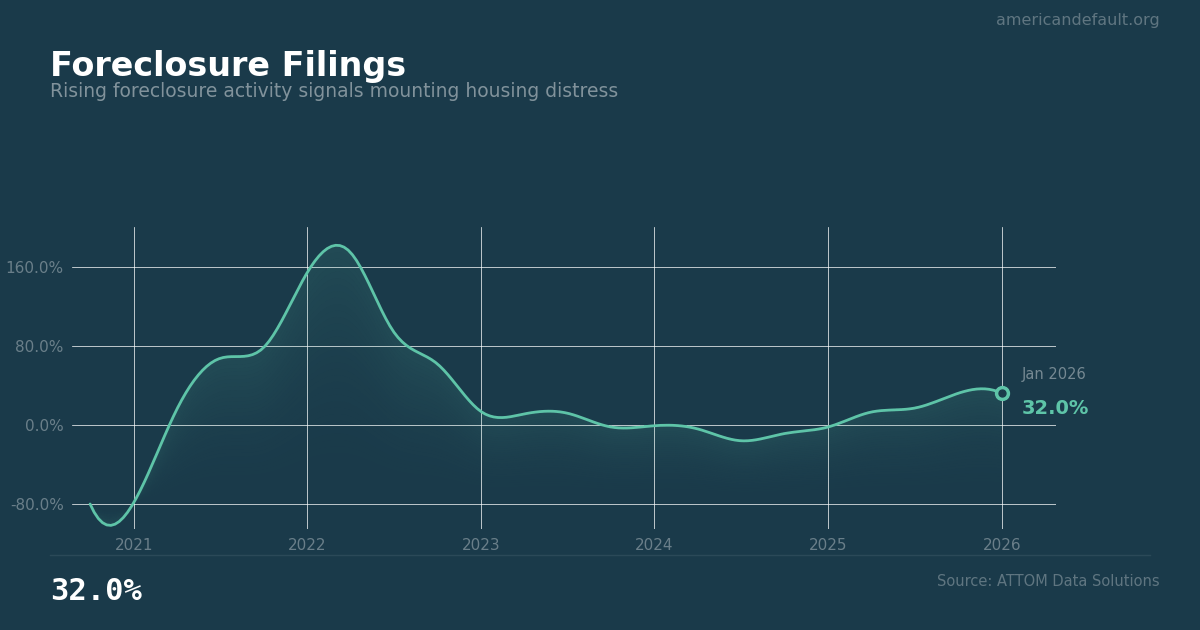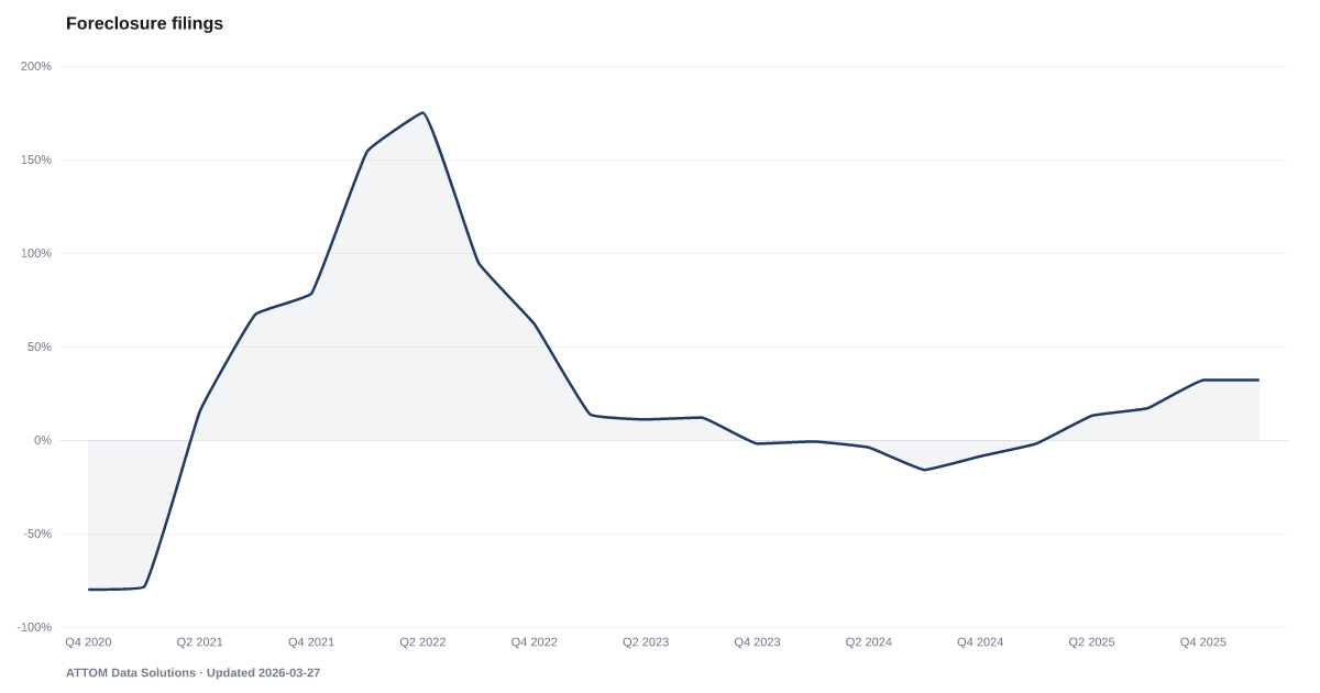 Foreclosure filings rose 32% year-over-year in Q1 2026, according to ATTOM Data Solutions. This follows three consecutive quarters of rising filings, marking a clear trend reversal from the pandemic-era suppression that pushed foreclosure activity to near zero.