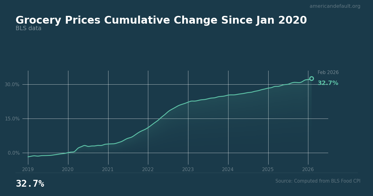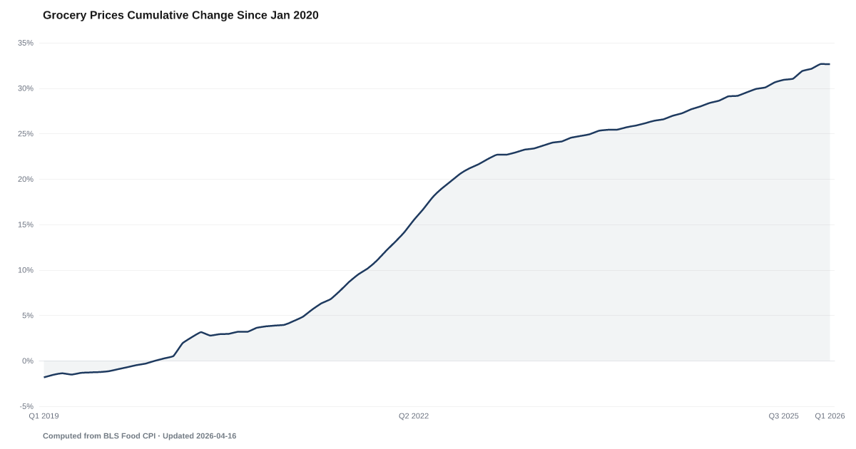 Grocery Prices Cumulative Change Since Jan 2020: 32.65% as of 2026-03, and worsening. Source: Computed from BLS Food CPI.