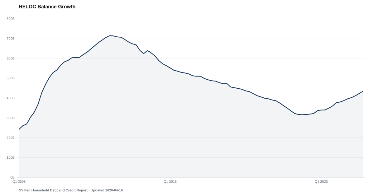 HELOC Balance Growth: $433.6B as of 2025-Q4, and worsening. Source: NY Fed Household Debt and Credit Report.