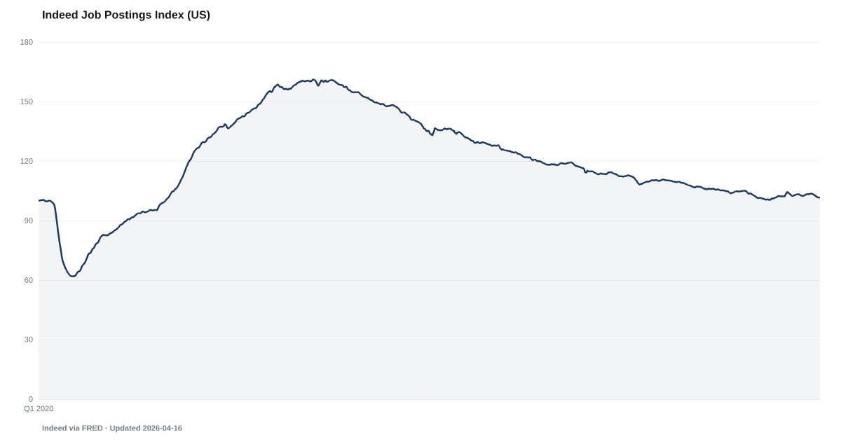 Published by Indeed Hiring Lab, available via FRED series IHLIDXUS. Updated daily with a 7-day moving average.