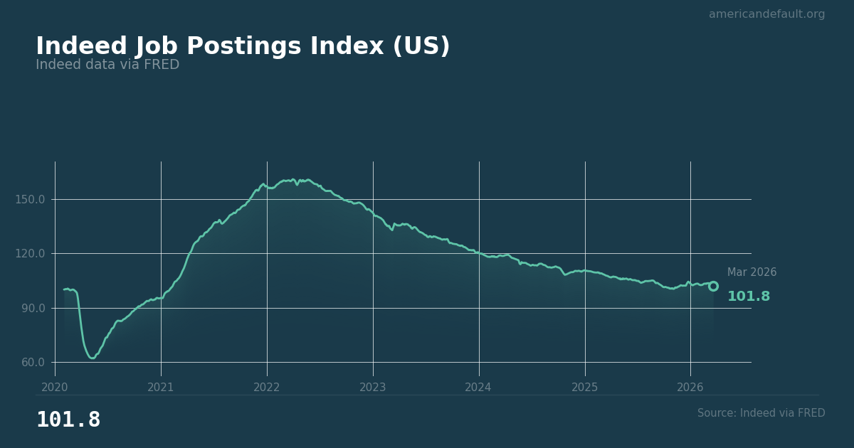 The Indeed Job Postings Index for the U.S. stood at 104.2 in the latest reading, normalized to a pre-pandemic baseline of 100 (February 1, 2020). This real-time measure of labor demand captures employer hiring intent faster than government surveys. Declining postings signal weakening demand for workers. Source: Indeed via FRED (IHLIDXUS).