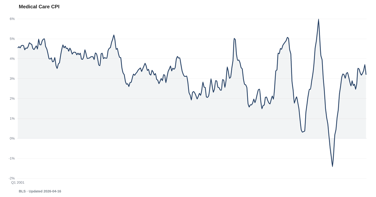 BLS data. Healthcare CPI dipped below zero in late 2023 on insurance methodology changes, then reversed sharply. The current rate compounds on years of above-average cost growth.