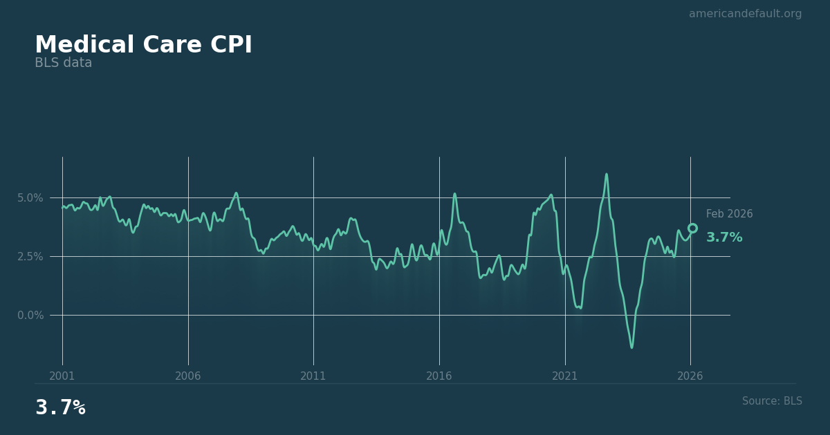 The medical care Consumer Price Index rose 3.71% year-over-year in the latest reading, outpacing overall CPI inflation. Healthcare costs are a significant driver of household financial distress — medical debt is the leading cause of bankruptcy filings and a key contributor to savings depletion. Source: BLS (CUSR0000SAM).