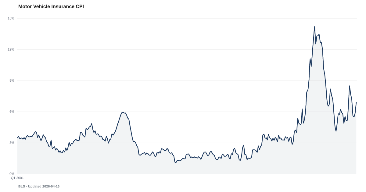 BLS data. After peaking at 14.2% in early 2023, auto insurance inflation has cooled but remains far above the 1-3% range that held for the decade before the pandemic.
