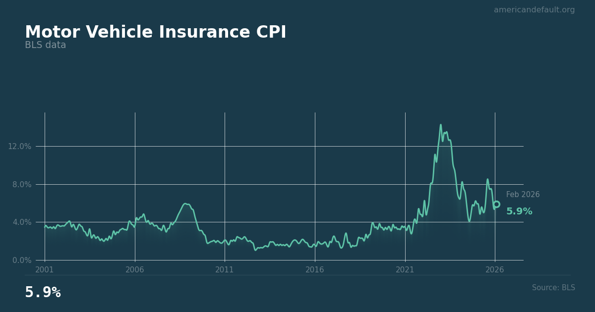 Motor vehicle insurance prices rose 5.9% year-over-year as of February 2026 (BLS series CUSR0000SETD). From the June 2023 peak of 19.8% YoY, the rate has declined but remains well above the long-run average of roughly 3-4% annual growth. Cumulatively, auto insurance premiums are approximately 50% higher than early 2020.