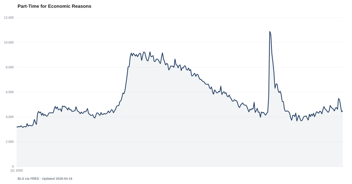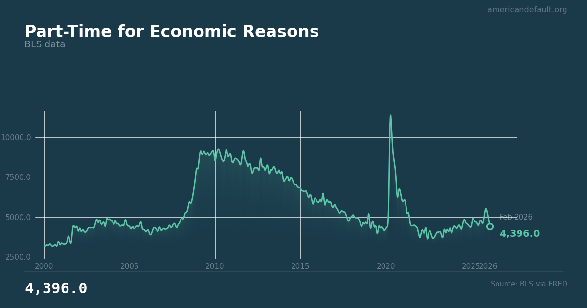 This counts workers who want full-time jobs but are stuck in part-time positions because of slack business conditions or inability to find full-time work. At 4.4 million, it signals significant hidden underemployment.