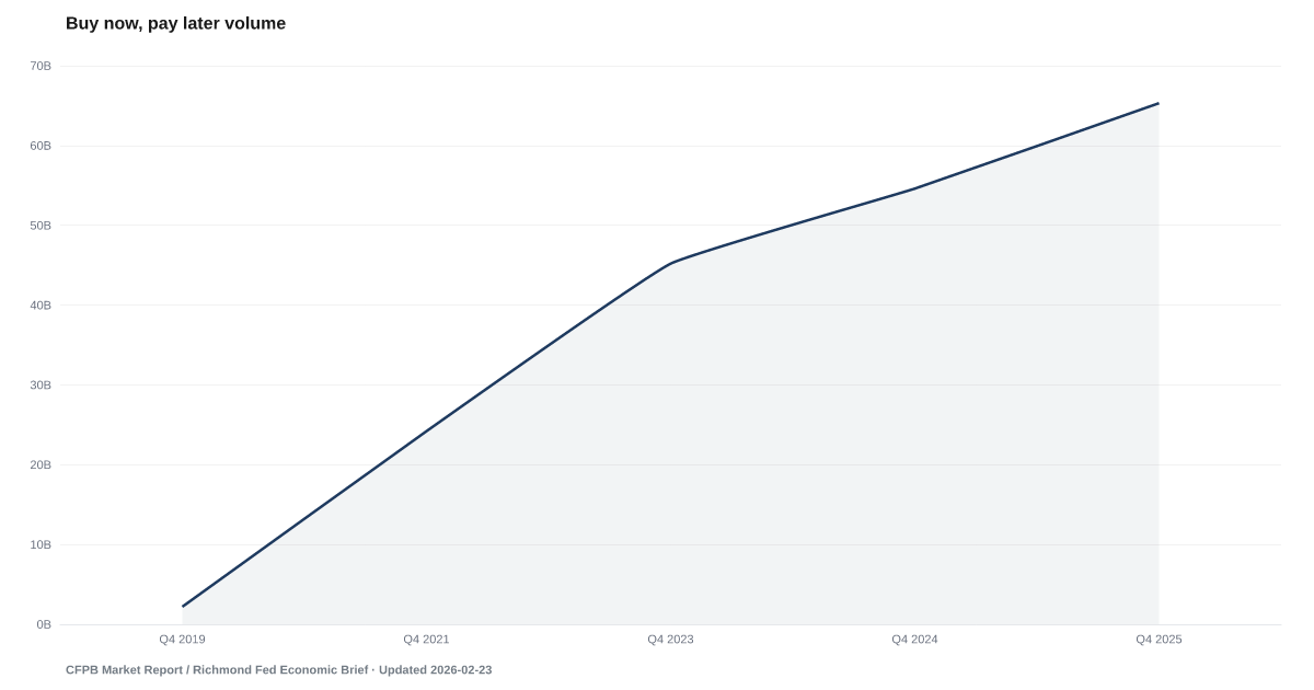 BNPL originations reached an estimated $65.3 billion in 2025 among the six largest lenders, according to Richmond Fed projections based on CFPB data. This is nearly 30 times the $2.2 billion originated in 2019. The CFPB found 53.6 million Americans used BNPL in 2023, with usage continuing to climb.