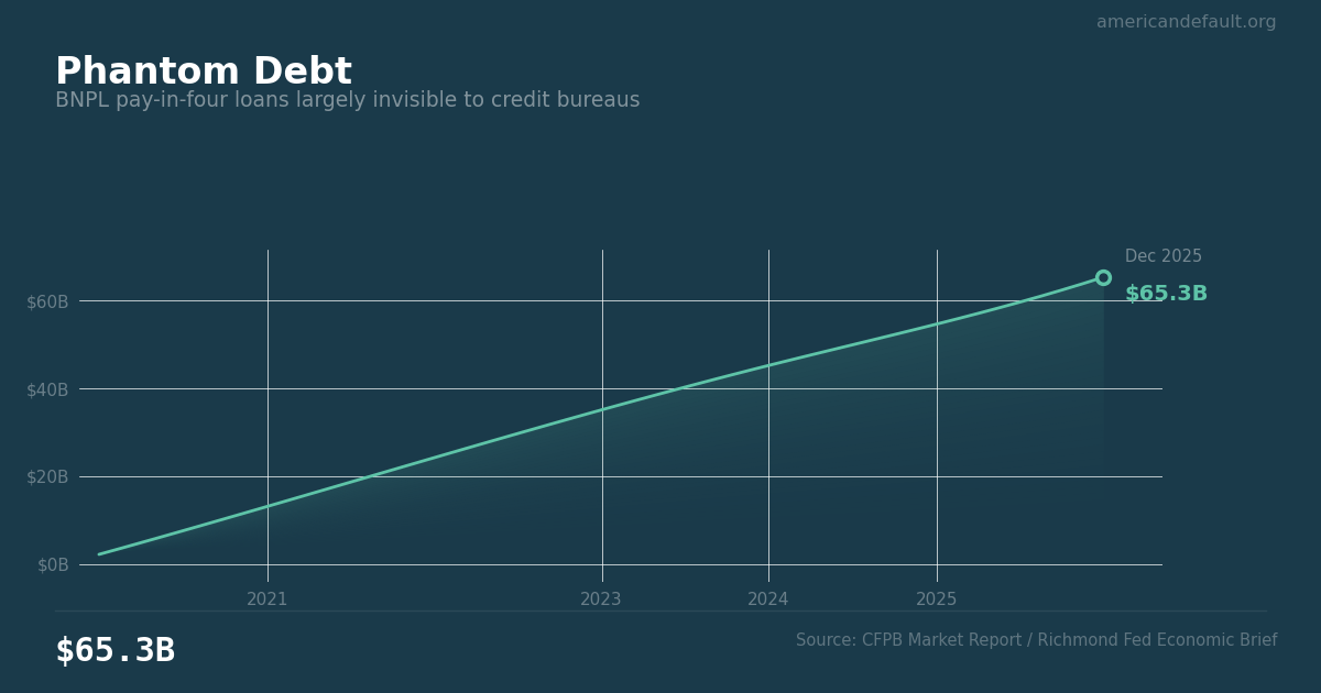 Buy Now Pay Later originations among the six largest lenders reached an estimated $65.3 billion in 2025, according to Richmond Fed projections based on CFPB data. That's nearly 30 times the $2.2 billion originated in 2019. The growth is extraordinary. What makes it different from other forms of consumer credit is that most BNPL pay-in-four loans remain invisible to credit bureaus, meaning traditional measures of household debt systematically undercount what families actually owe.