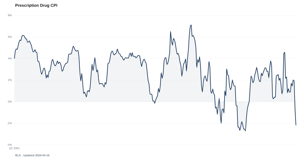 The BLS prescription drug CPI declined 0.68% year-over-year. However, this reflects negotiated prices — many consumers without insurance or with high-deductible plans still face rising out-of-pocket costs.