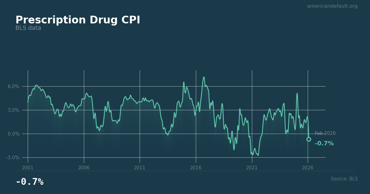 BLS data. Drug price deflation reflects Medicare negotiation effects and generic competition. One of the few CPI categories providing cost relief to households.