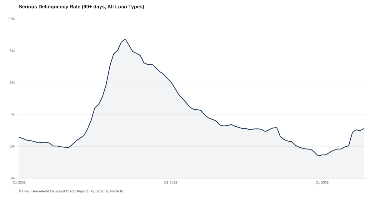 This rate measures the share of all consumer debt balances — mortgages, auto loans, credit cards, student loans — that are 90 or more days past due. At 3.12% in Q4 2024, it provides a comprehensive view of household debt distress.