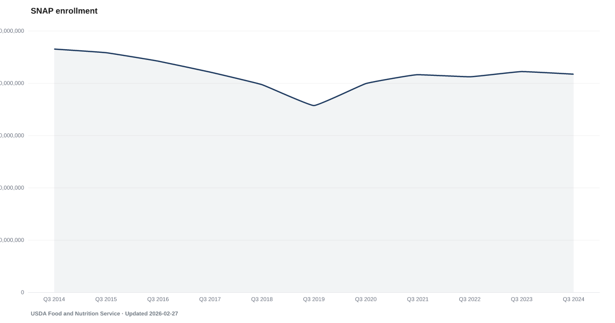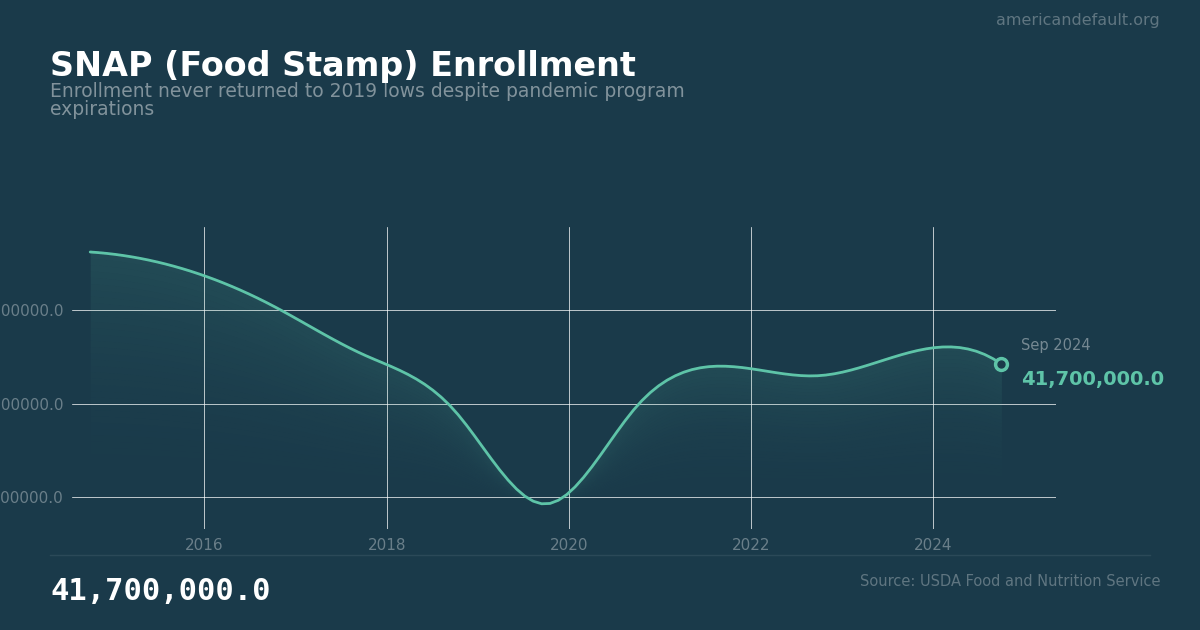 SNAP (Food Stamp) Enrollment: 41,700,000 as of 2024-09, and worsening. Source: USDA Food and Nutrition Service.