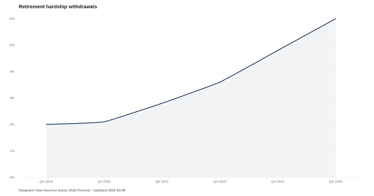 6.0% of Vanguard 401(k) participants took hardship withdrawals in 2025, according to the Vanguard How America Saves 2026 Preview. This is triple the 2.0% rate in 2019 and the highest since Vanguard began tracking this metric. The rate has increased six consecutive years.