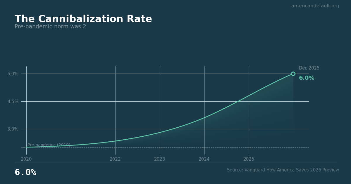 6.0% of Vanguard 401(k) participants took hardship withdrawals in 2025, according to the Vanguard How America Saves 2026 Preview — triple the 2.0% pre-pandemic rate and the highest on record. Six consecutive annual increases with no sign of slowing. The SECURE 2.0 Act removed barriers to access, but the root cause is depleted emergency savings forcing households to cannibalize long-term retirement assets to cover today's bills. Source: Vanguard How America Saves 2026 Preview.