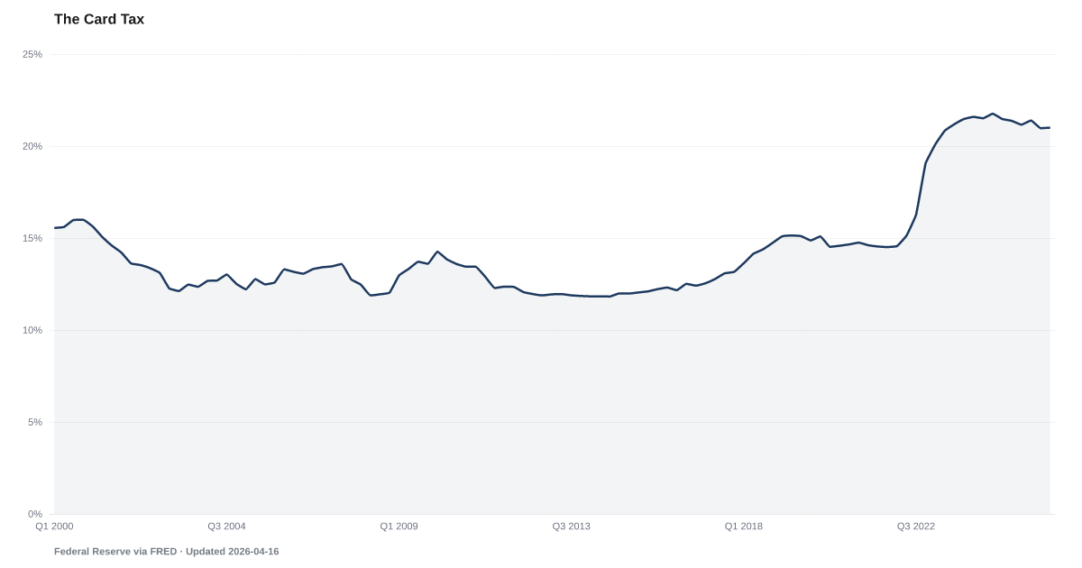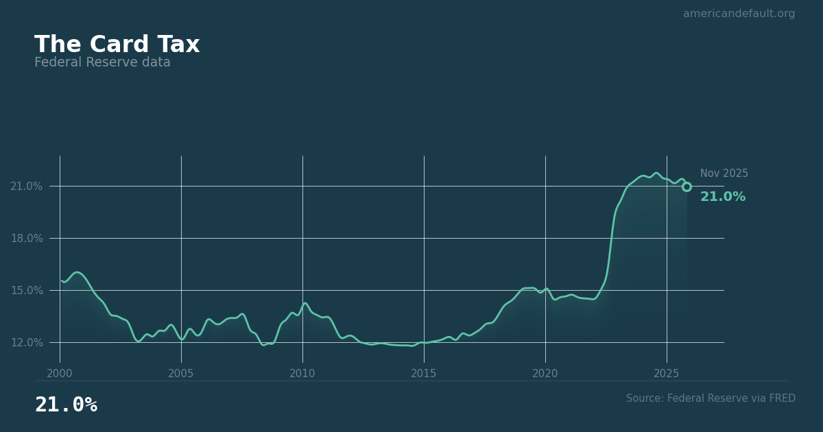 The average commercial bank credit card interest rate stood at 20.97% in Q4 2025, according to the Federal Reserve's quarterly survey — the highest in the series' history. For context, the average APR was around 12% as recently as 2015 and 14.5% before the Fed's 2022–2023 rate-hiking cycle. The rate has remained elevated even as the Fed has paused, because credit card pricing has become structurally disconnected from the federal funds rate.