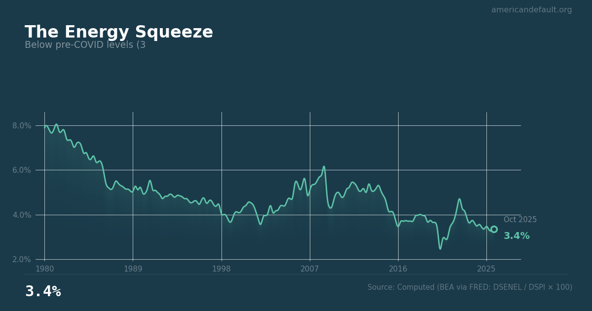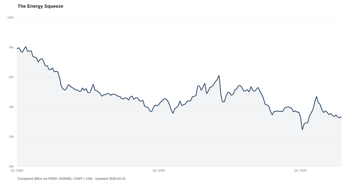 The Energy Squeeze tracks household energy costs as a percentage of total spending, currently 3.35%. It captures utility bills and fuel costs as a share of the household budget.