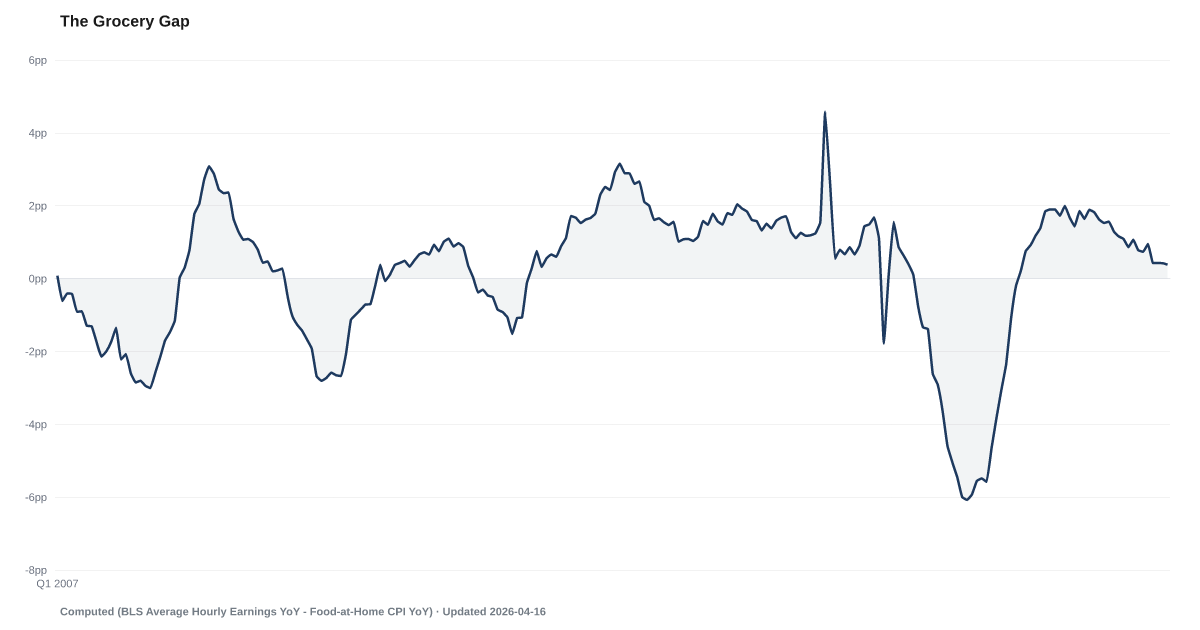 Grocery wage cushion narrowed to +0.48pp — down from +1.5pp a year ago as food prices re-accelerate