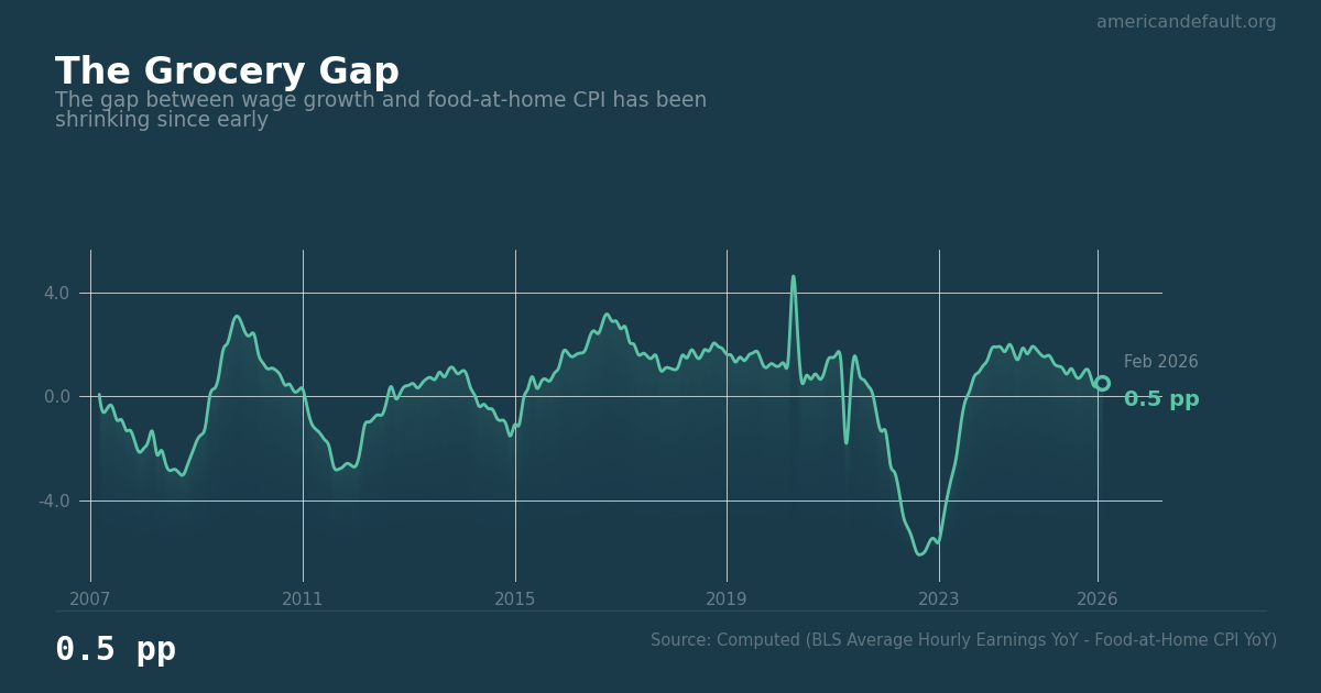 Food prices are rising 0.51 percentage points faster than overall CPI in the latest reading. The Grocery Gap measures this spread between food-at-home inflation and general inflation — when positive, it means grocery costs are outpacing other prices, disproportionately burdening lower-income families who spend a larger share of income on food. Source: BLS (CUSR0000SAF1 minus CPIAUCSL).