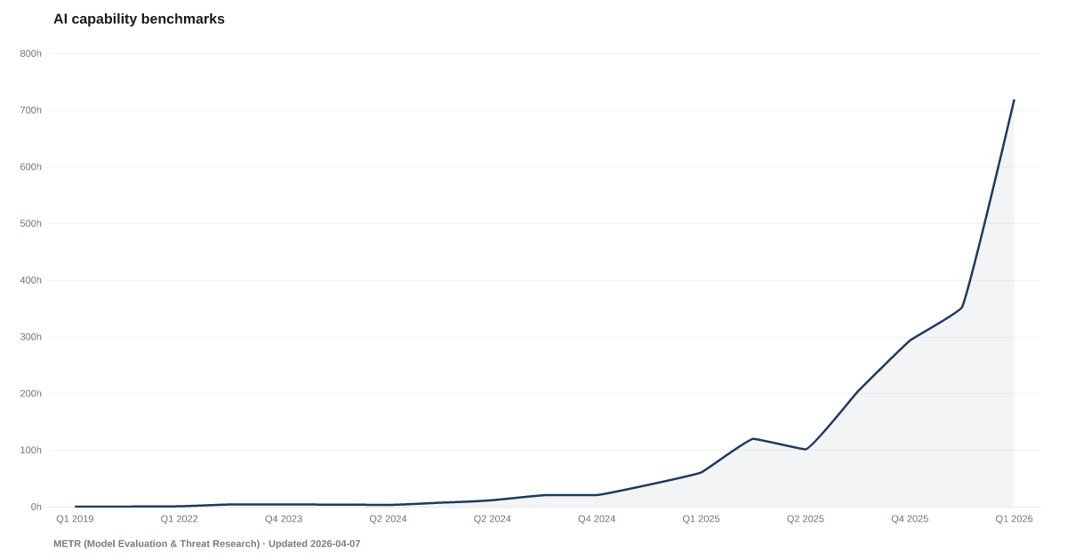 METR (Model Evaluation and Threat Research) conducts standardized benchmark evaluations of frontier AI models, measuring their ability to perform real-world professional tasks autonomously over extended durations. Results are published as new model capabilities are evaluated.