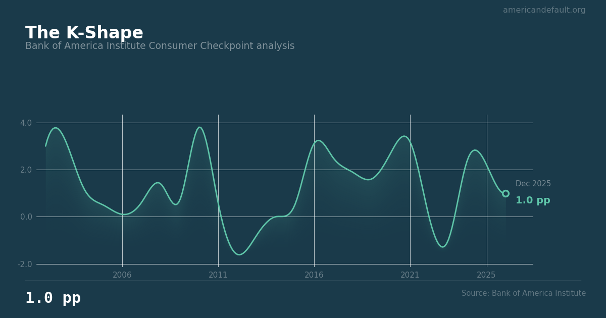 The K-shaped pattern was initially described as a temporary post-pandemic phenomenon expected to resolve as the labor market tightened. Five years later, the divergence has become structural, with the gap widening to levels not seen since 2016.