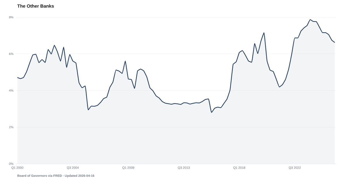 Smaller banks serve borrowers who are less likely to qualify for prime rates at major institutions. These borrowers carry debt at even higher effective interest rates and have thinner financial buffers. They are the most financially fragile segment of the credit market.