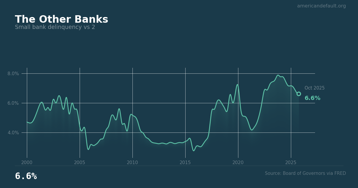 The divergence has persisted at elevated levels since 2017, when small bank delinquency surged from around 3% to over 5%. The gap has remained wide since, suggesting a structural rather than cyclical difference in the financial health of borrowers served by different parts of the banking system.