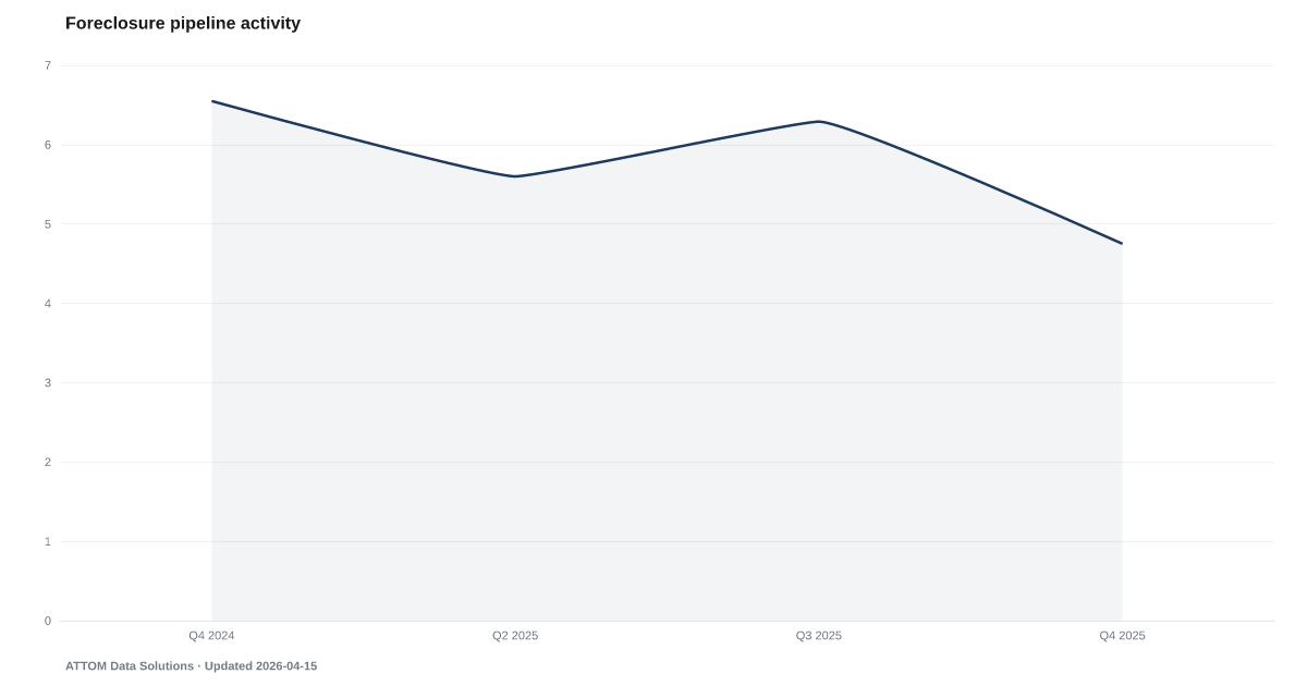 ATTOM Data Solutions tracks foreclosure activity from county recorder offices nationwide, broken down by default notices (starts), scheduled auctions, and bank repossessions (completions). Data is published quarterly.