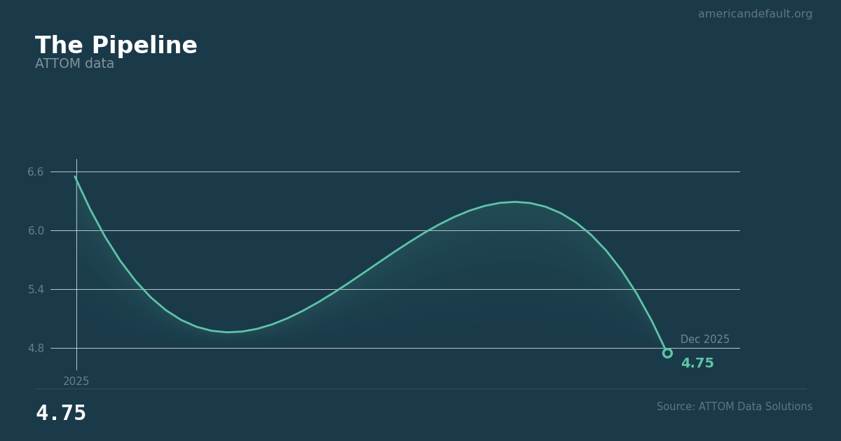 ATTOM data. A high starts-to-completions ratio signals that more cases are entering the pipeline than exiting it, though many will resolve before reaching sale.