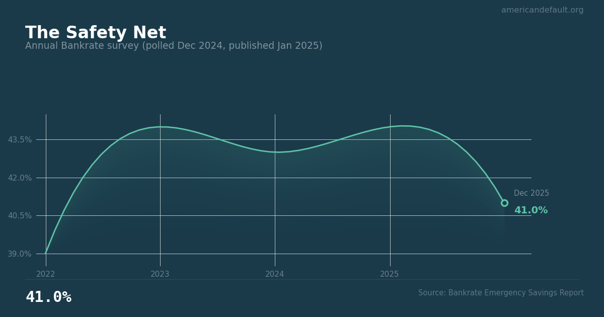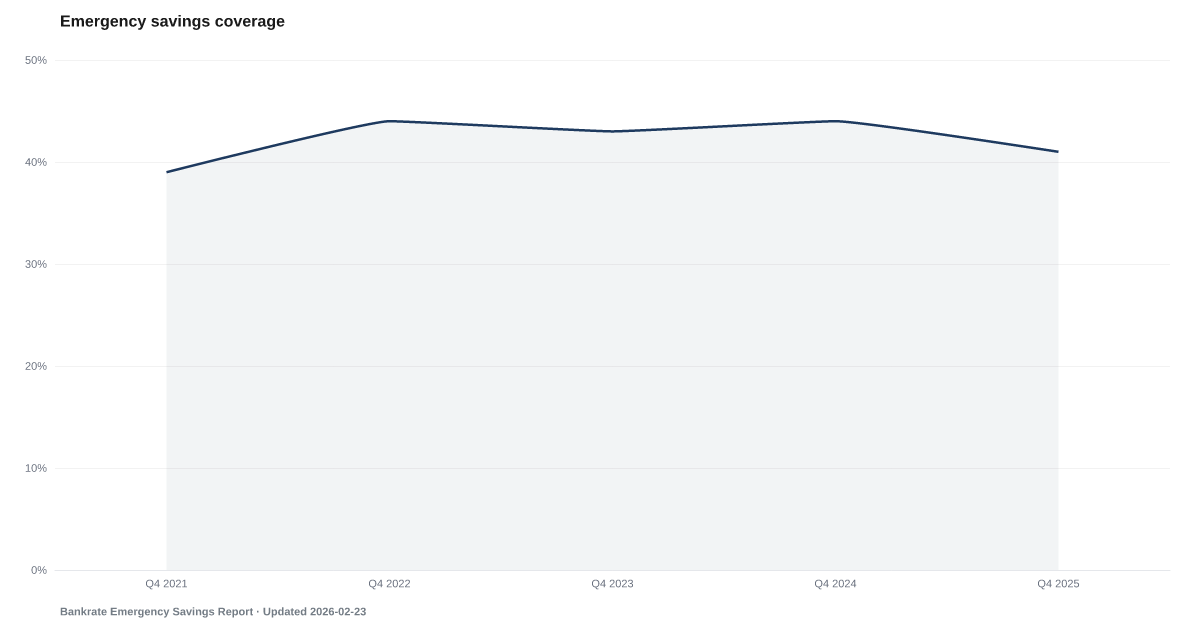 Bankrate’s annual Emergency Savings Report, based on a survey of 1,052 adults conducted in December 2024 and published January 2025, found that just 41% of Americans could pay for a $1,000 emergency from savings — down 3 percentage points from the prior year and the weakest reading since the survey began.
