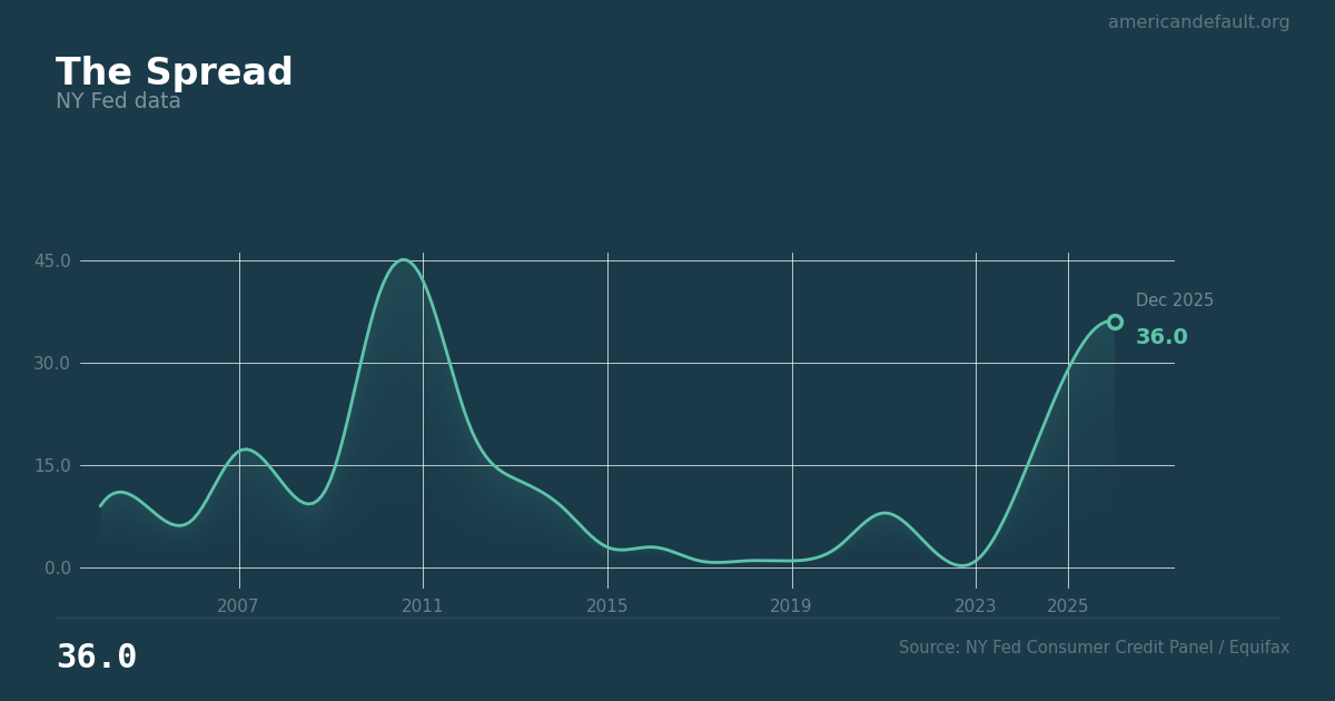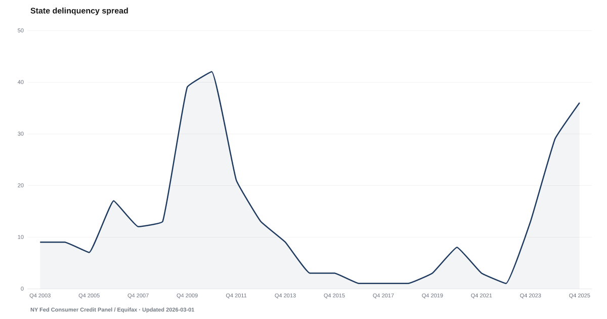 The number of U.S. states where credit card delinquency exceeds 10% is a geographic concentration measure of household debt distress. When delinquency crosses 10% at the state level, it indicates that debt problems have spread beyond individual borrowers to affect the broader regional economy. Source: NY Fed Consumer Credit Panel.