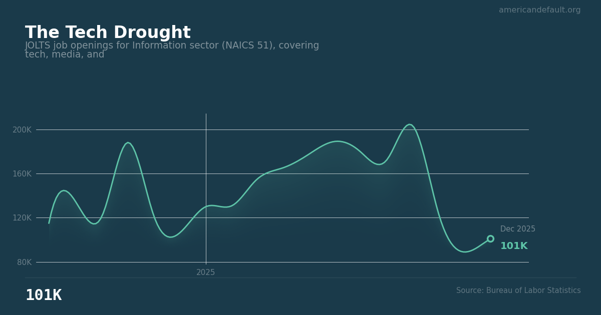 American Default tracks tech openings from BLS JOLTS (Job Openings and Labor Turnover Survey) and Indeed's job posting index, which provides near-real-time data on employer hiring intent.