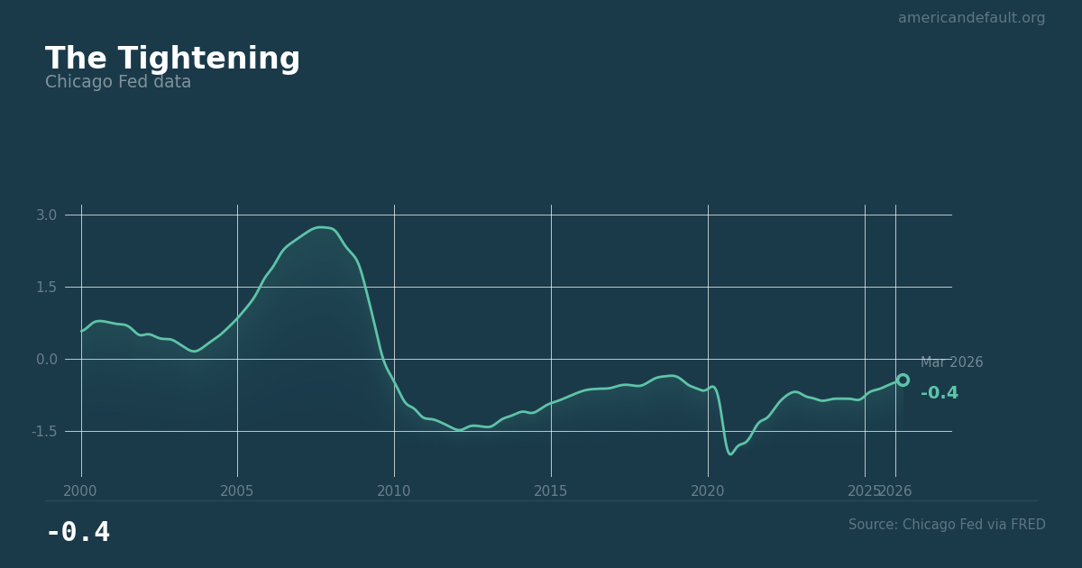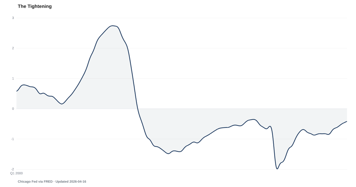The Chicago Fed's NFCI Non-Financial Leverage Subindex stood at -0.47 in February 2026, up from -0.86 in late 2023. In this index, zero represents average historical conditions and positive values indicate tighter-than-average leverage. The current reading is still negative — meaning conditions are technically looser than the historical average — but the speed and direction of the move matters more than the absolute level. The index has risen nearly 0.4 points since its recent trough, the fastest tightening pace since the post-pandemic normalization.