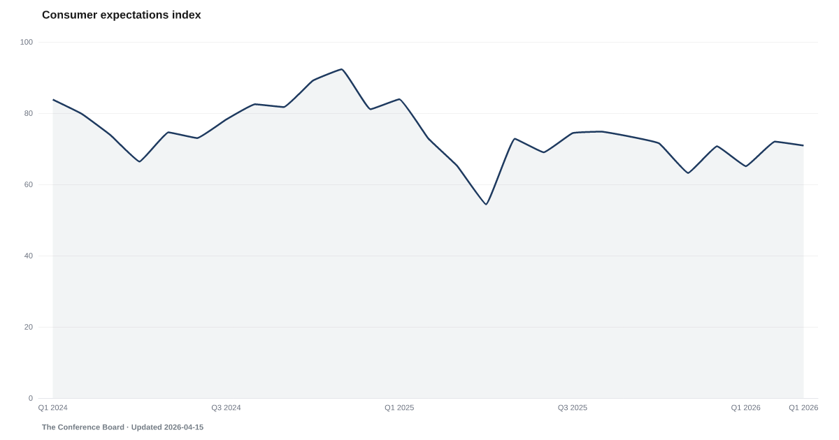 The Conference Board expectations index specifically asks about the six-month outlook, while Michigan measures broader sentiment about current and future conditions. Both are currently signaling distress: expectations at 72.0 and Michigan sentiment at 56.4. When two independent surveys agree, the signal is more reliable.