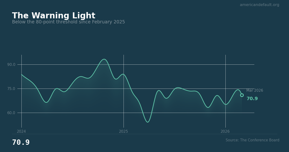 Every prior sustained breach below 80 has been followed by a recession within 6–12 months. Some analysts argue the current signal may be distorted by political polarization, which increasingly colors consumer survey responses. However, tightening financial conditions and depleted household savings suggest the pessimism is grounded in financial reality.